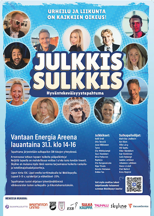 Lauantaina 31.1. 9-14 välierät ja 16-21 finaalit, näiden välissä tauolla järjestetään JulkkisSulkkis tapahtuma klo 14-16.